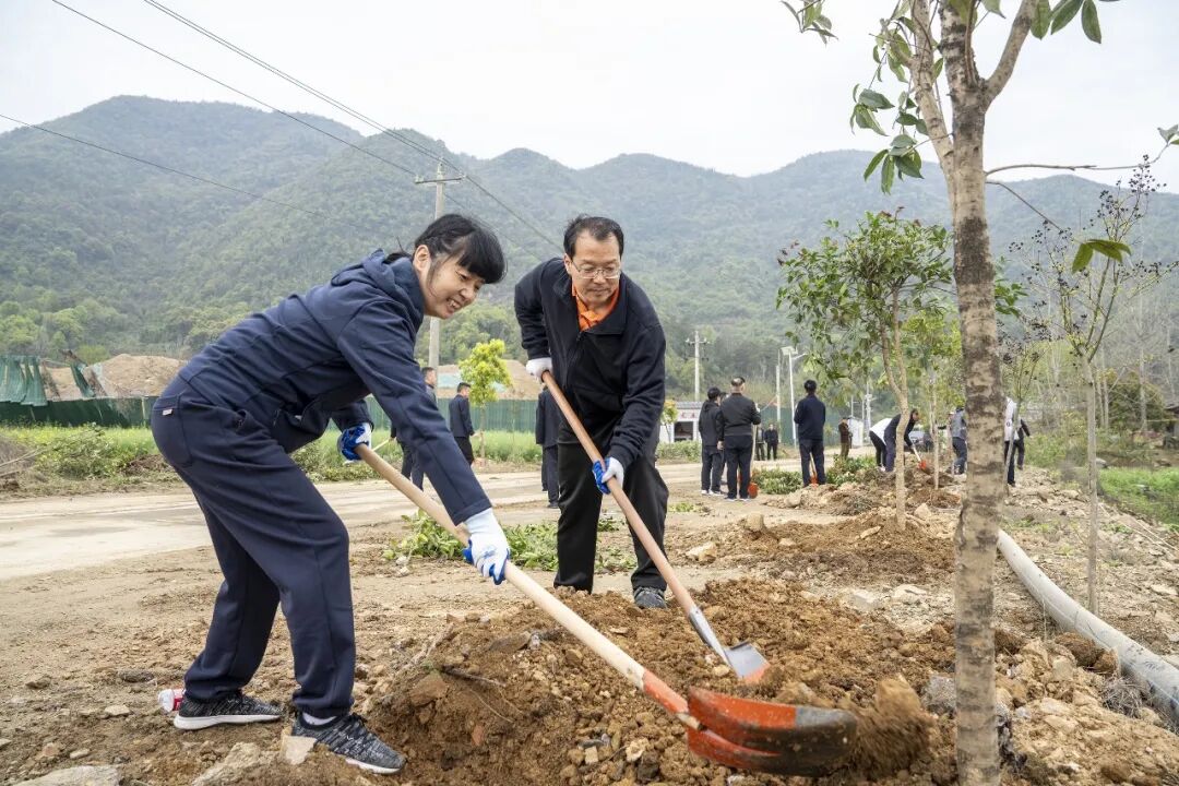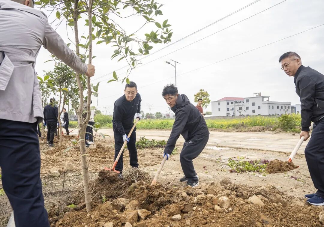 植树现场,机关干部职工们分工协作、默契配合,挥锹铲土、挖坑扶苗、培土围堰、提水浇灌。每一道工序都细致认真、一丝不苟,现场一派热火朝天的忙碌景象。经过辛勤劳动,一株株新栽种的苗木整齐挺立、迎风吐翠,为春日的官塘村增添了勃勃生机。