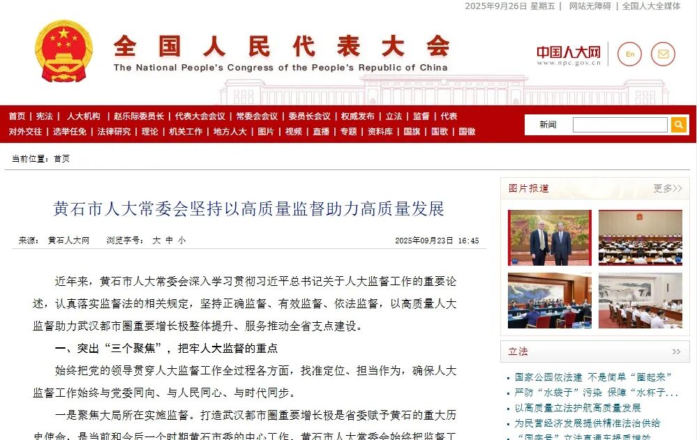 9月23日,中国人大网站报道了黄石市人大常委会坚持以高质量监督助力高质量发展的经验做法,全文如下。
