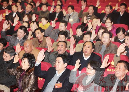 代表们举手表决。 记者 何戈 摄