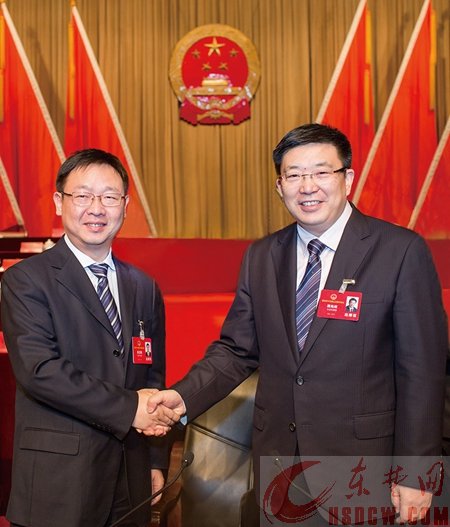 市委书记、市人大常委会主任周先旺与新当选的市长董卫民亲切握手,表示祝贺。记者 何戈摄