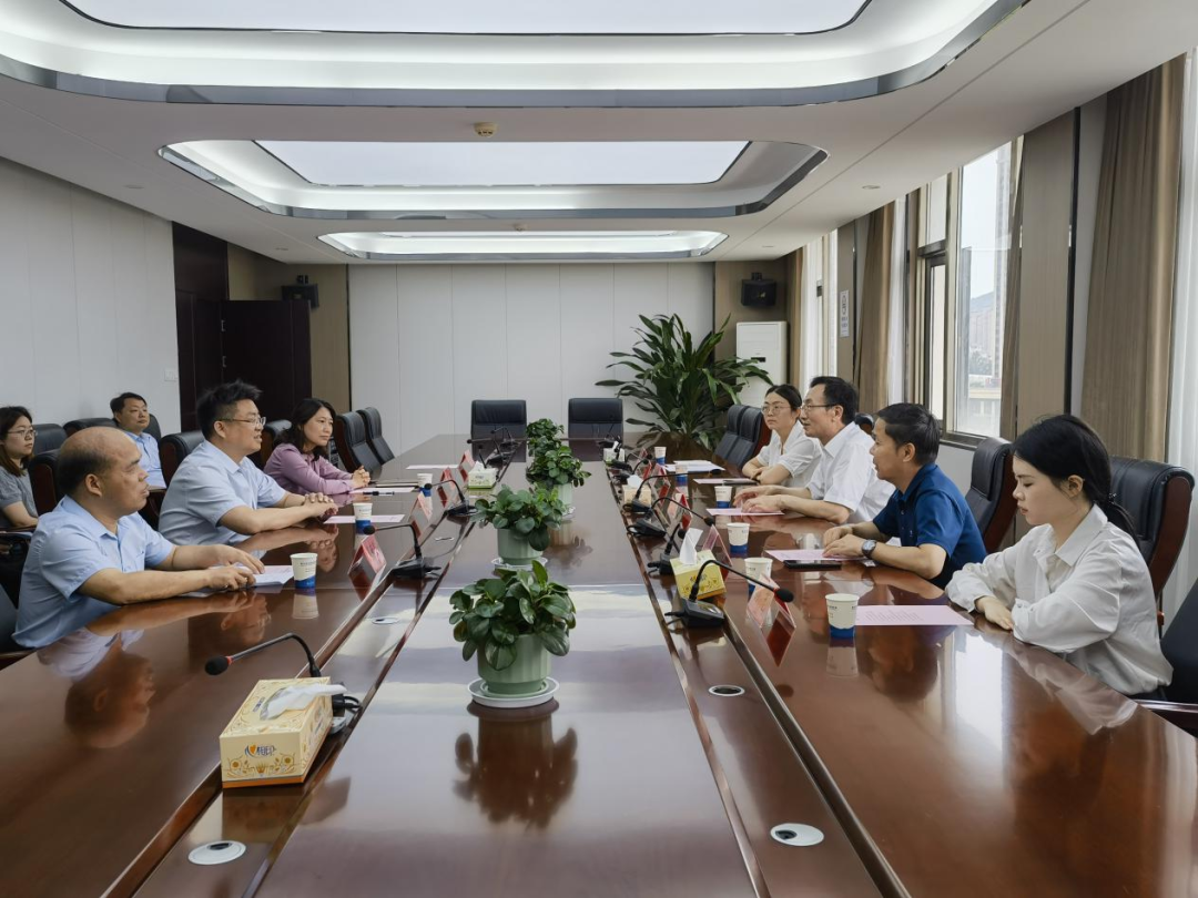 王见祥(右三)、李麟(右二)与市住建局党组书记、局长黄和明(前排左二)以及优秀科技工作者王新刚(前排左一)座谈