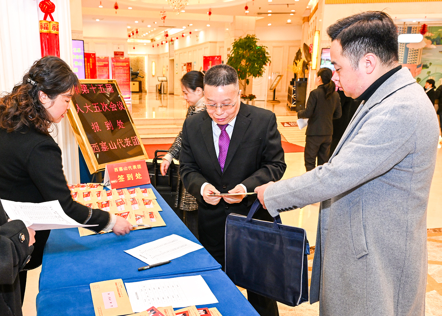 核对信息、签到登记、领取资料……报到现场,人大代表们在工作人员的指引下有序报到认真做好参会前准备工作。